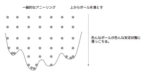 一般的なアニーリングでは、安定的なスピンの重ね合わせ状態が最初にあって、それを基底状態に向かって状態を変化(収束)させていきます。CIMは、光パルスを利用することで、パルスのエネルギーを徐々に増やして、「不安定なスピンの状態(そもそも光パルス…